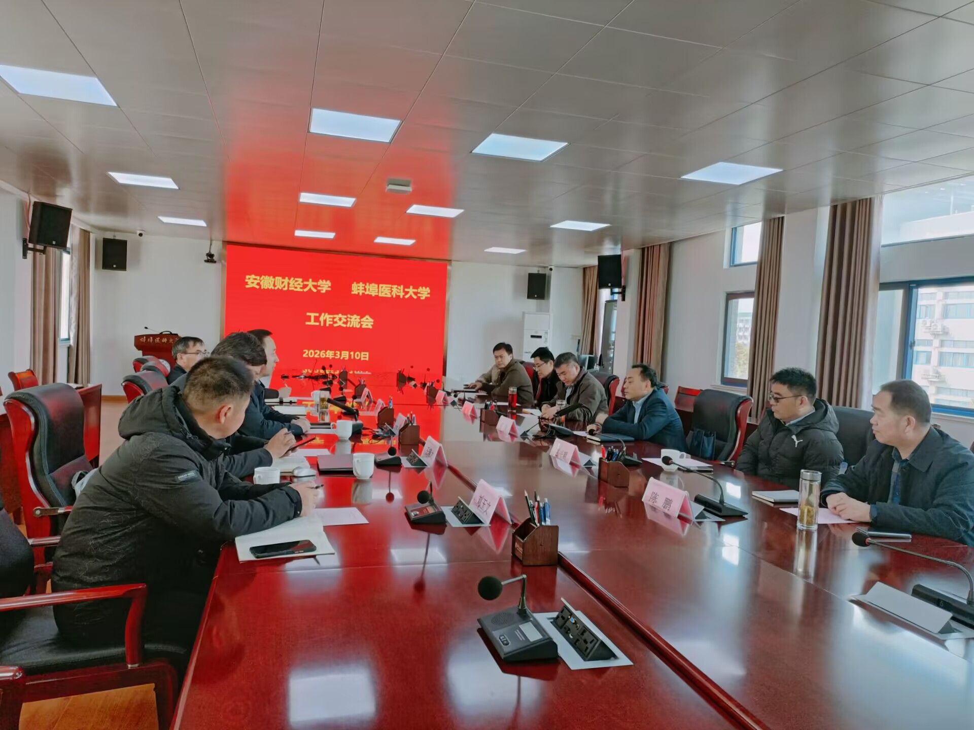 3月10日下午,安徽财经大学副校长王兵、学术副校长赵兴明率队到访蚌埠医科大学,双方就深化校际合作召开专题座谈。校党委常委、副校长刘浩主持会议,两校科研部门负责人、医学信息与工程学院领导及骨干教师代表共同参会。