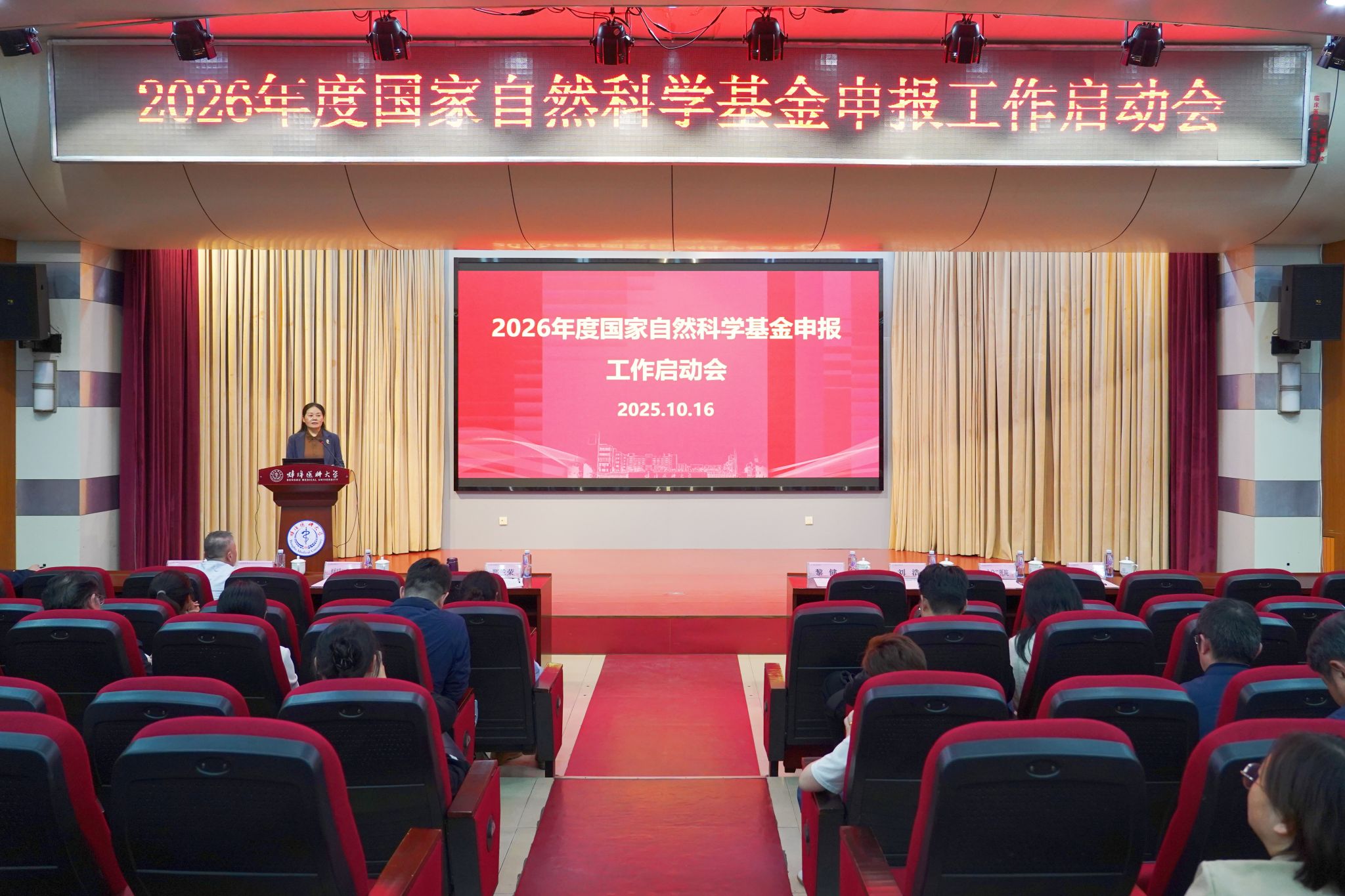 10月16日,学校在学术报告厅召开2026年度国家自然科学基金申报工作启动会。特邀国家自然科学基金重大研究计划终审专家、中国老年医学学会副会长黎健教授作国家自然科学基金申报工作专题辅导报告,各学院及附属医院院长、分管科研副院长,教学医院负责人,全校符合申报条件的科研人员参会。启动会由校党委常委、副校长刘浩主持,校长郑兰荣作动员讲话。